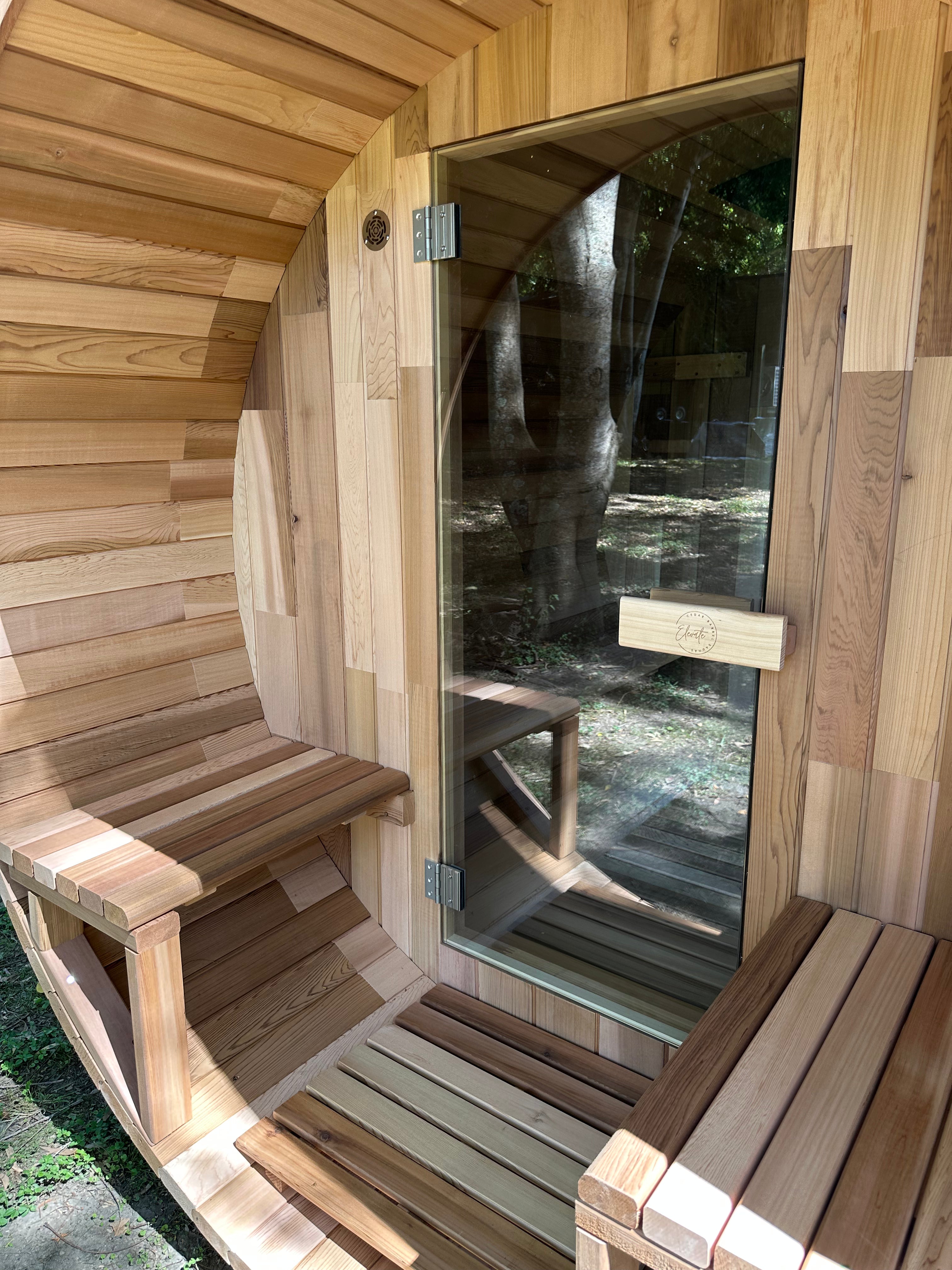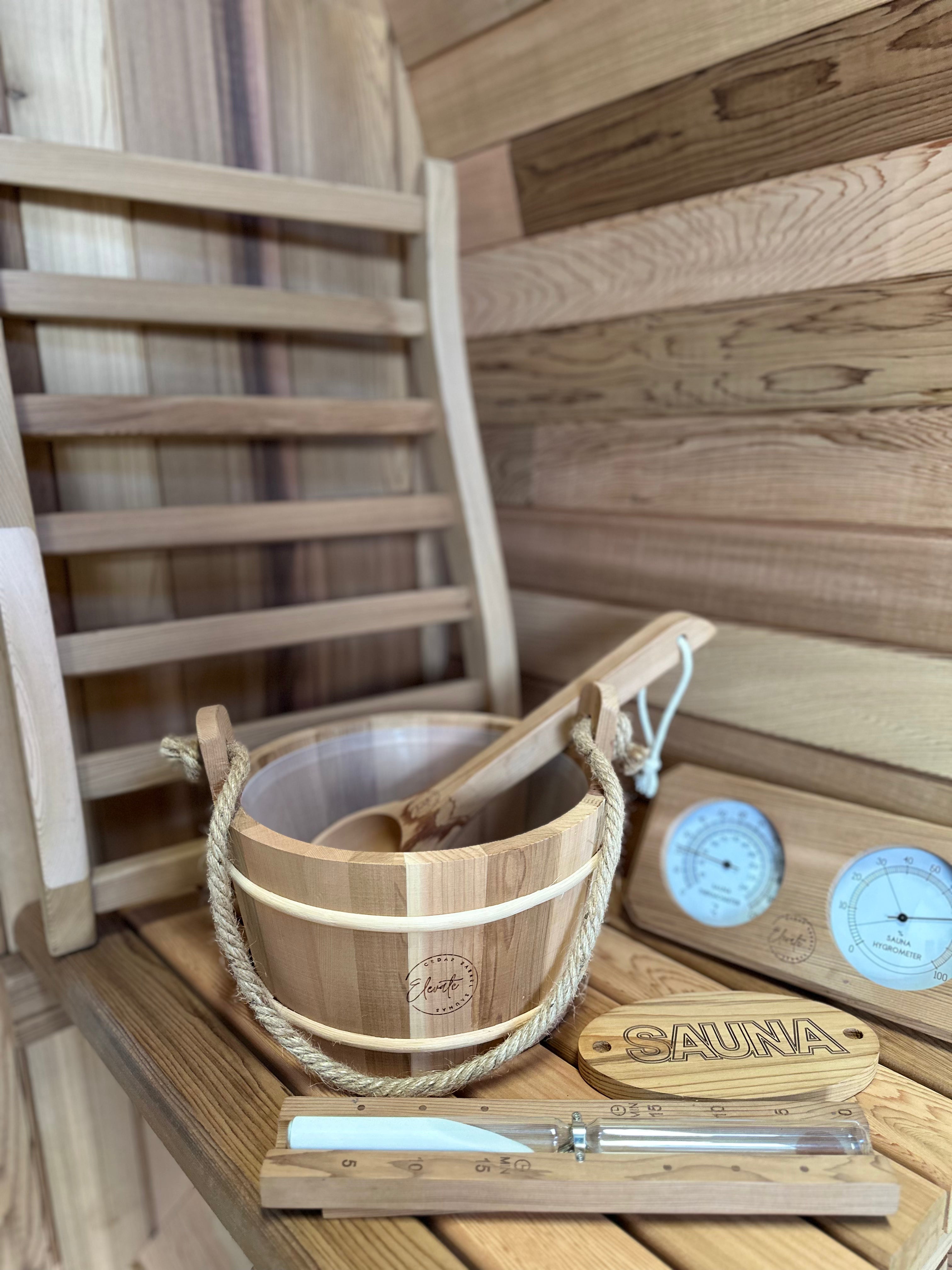 Each sauna comes fully equipped with bucket & ladle, volcanic rocks, thermometer, sand timer, interior light, towel hook, and backrests—everything you need for a complete sauna experience, with no hidden costs.