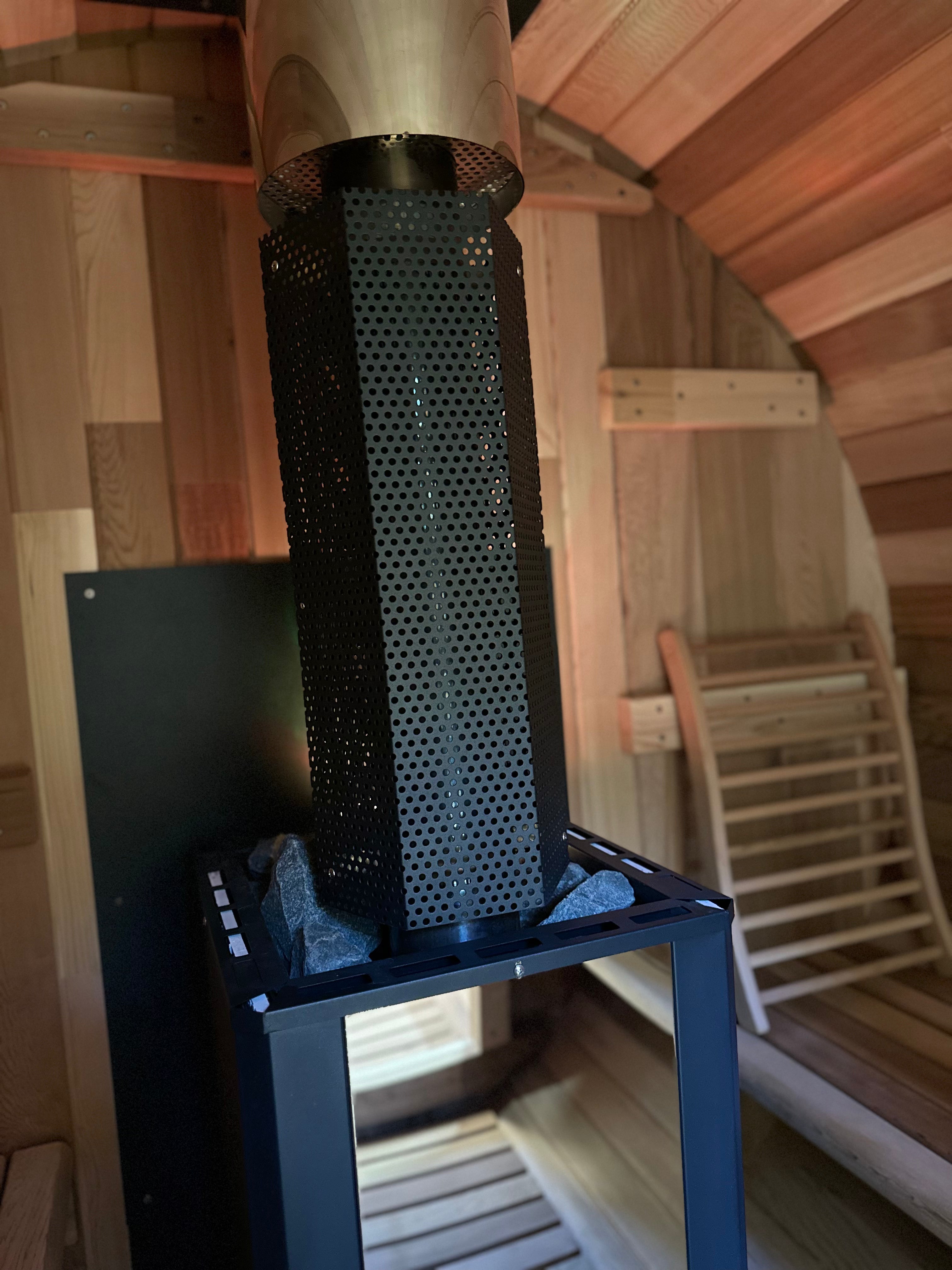 The natural draw of the chimney ensures excellent airflow, while the curved barrel shape helps circulate heat efficiently—perfect for immersive, traditional sauna sessions in any environment.