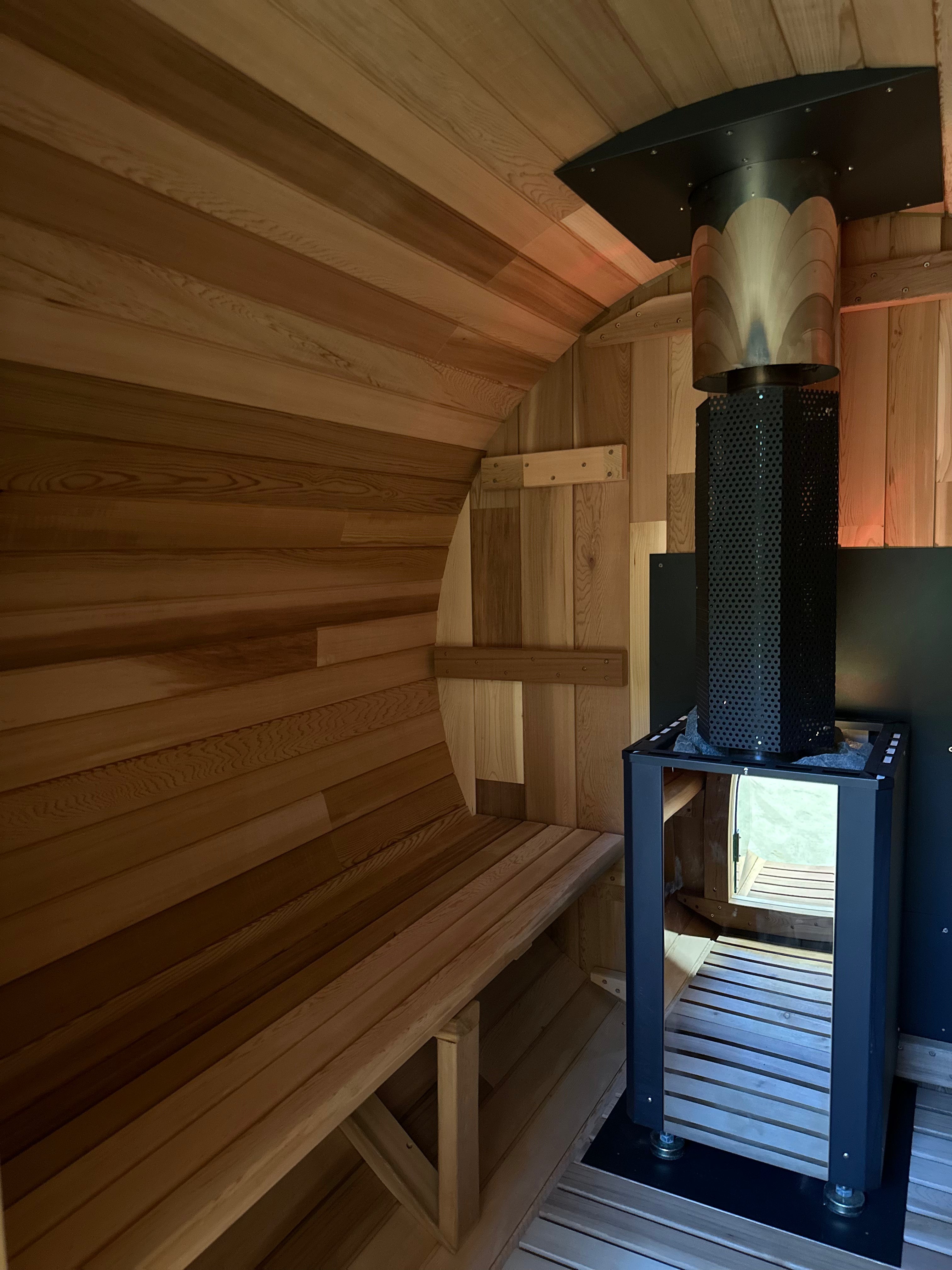 Our wood-fired barrel sauna offers an authentic, efficient sauna experience—completely off-grid. The high-performance, rear-fed stove allows you to load firewood from outside the sauna, keeping the interior clean, smoke-free, and uncluttered. It heats quickly and evenly, delivering deep, radiant warmth and rich steam when water is poured over the stones.